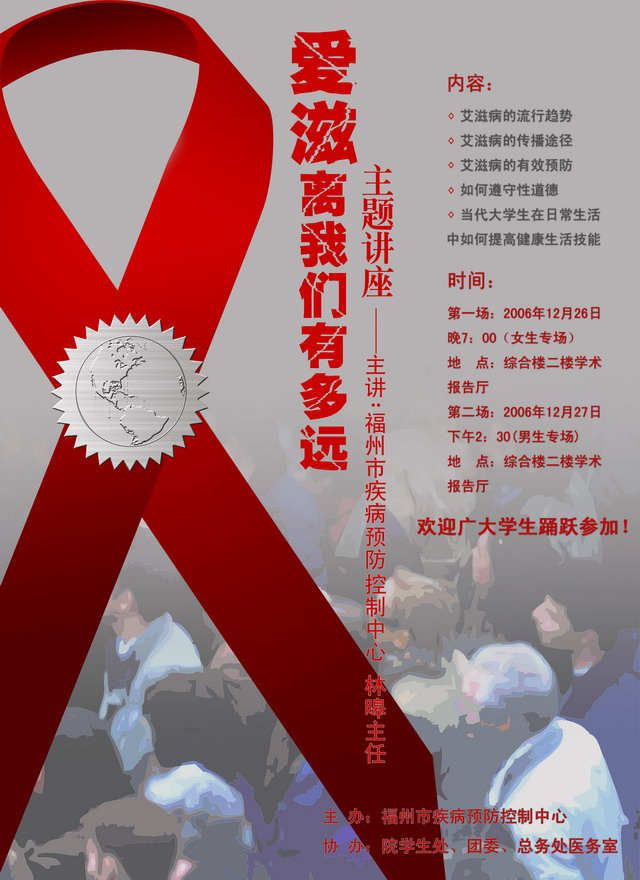 艾滋病預(yù)防教育活動(dòng)一直以來都是我院健康教育工作的重要組成部分。為了進(jìn)一步引導(dǎo)廣大學(xué)生以積極科學(xué)的態(tài)度對待艾滋病,維護(hù)自身健康和安全,提高疾病預(yù)防意識和健康生活技能,院學(xué)生處、團(tuán)委聯(lián)合醫(yī)務(wù)室于12月中旬在全院學(xué)生中開展“紅絲帶”健康宣傳教育系列活動(dòng)?;顒?dòng)包括500多名學(xué)生的在線調(diào)查、“遏制艾滋,履行承諾”宣傳圖片展、“艾滋離我們有多遠(yuǎn)”健康教育講座、“艾滋知多少”問卷調(diào)查活動(dòng)和“飄飛的紅絲帶”艾滋病健康宣傳演講賽等,內(nèi)容豐富,形式多樣,深受廣大學(xué)生的歡迎和好評。在圖片展現(xiàn)場,許多學(xué)生面對圖片資料感慨萬分;在教育講座現(xiàn)場,學(xué)生們踴躍發(fā)言,紛紛就如何增強(qiáng)健康生活技能提出種種疑惑;在演講比賽現(xiàn)場,14位選手精彩的演講,贏得了現(xiàn)場陣陣掌聲,最后由人文社科系05文秘班陳夏洋同學(xué)摘得桂冠。福州市疾病控制中心林華主任對我院學(xué)生關(guān)注艾滋疾病、理解艾滋病人的科學(xué)觀念給予充分肯定。(學(xué)生處 程碧花)