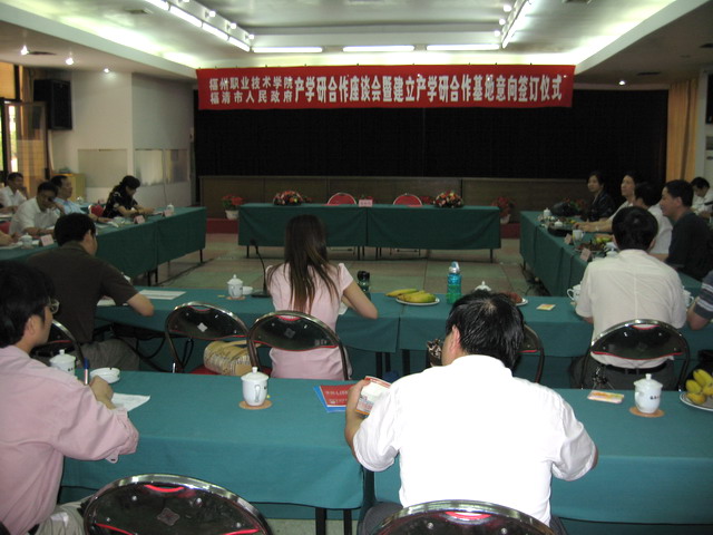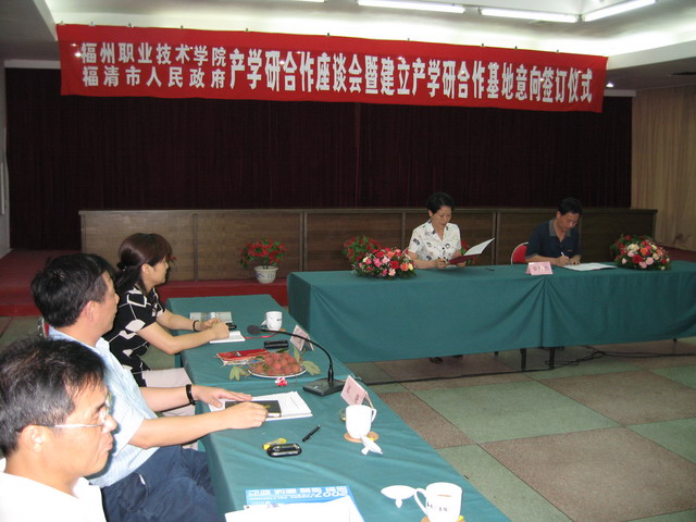 福清市委副書記鄭曉同志主持會議并代表福清市政府致歡迎辭,福州市委教育工委副書記、福州職業(yè)技術(shù)學(xué)院黨委書記俞云金同志做了重要講話。隨后,福清市常務(wù)副市長王德玉同志簡要介紹近幾年福清市經(jīng)濟(jì)發(fā)展情況。福州職業(yè)技術(shù)學(xué)院黨委副書記、院長孫芳仲同志介紹福州職業(yè)技術(shù)學(xué)院情況。雙方就建立產(chǎn)學(xué)研合作基地進(jìn)行座談。金昌余副院長代表福州職業(yè)技術(shù)學(xué)院與福清市人民政府陳少華副市長簽訂《意向書》。