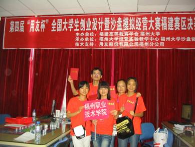 福州職業(yè)技術(shù)學院經(jīng)濟系會計電算化專業(yè)06級施鴻、陳瓊以及07級湯麗勤、韓丹萍、黃小龍同學在張祥艷老師的辛勤指導下,勇奪中國高等教育學會與用友軟件股份有限公司聯(lián)合主辦的第四屆“用友杯”全國大學生創(chuàng)業(yè)設(shè)計暨沙盤模擬經(jīng)營大賽福建賽區(qū)決賽冠軍,并于今年7月代表福建賽區(qū)進軍全國總決賽。