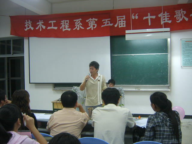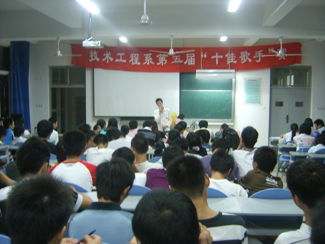 技術(shù)工程系學生會于2008年10月16日在新教學樓309大教室舉行技術(shù)工程系第五屆“十佳歌手”賽。系黨總支書記、輔導員被邀請作為評委。比賽在輕松而熱烈的氣氛中進行,最后評出的“十佳歌手”是:張富強、郭松、林杰、鄭夢熒、劉宇涵、錢麗、陳云婷、陳益鑫、夏盛聯(lián)、陳雅珍。06級汽車運用技術(shù)專業(yè)張富強獲得第一名。參賽歌手中有不少是08級新生,他們通過自愿報名、初賽、復賽進入決賽。這次比賽的亮點一是有的歌手用吉他彈唱形式,二是有的歌手用英語演唱。