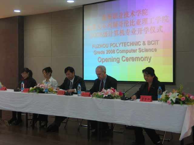 11月20日上午,福州職業(yè)技術(shù)學(xué)院與加拿大不列顛哥倫比亞理工學(xué)院(BCIT)聯(lián)合舉辦的2008級(jí)中加合作班開學(xué)典禮在學(xué)術(shù)報(bào)告廳隆重舉行。BCIT計(jì)算機(jī)學(xué)院院長(zhǎng)Kim Dotto、BCIT亞洲合作項(xiàng)目經(jīng)理Tracy Wang,福州職業(yè)技術(shù)學(xué)院院長(zhǎng)林承超、副院長(zhǎng)詹碧卿、黨政辦主任趙君堯、教務(wù)處處長(zhǎng)林寧、計(jì)算機(jī)系全體教師與中加班學(xué)生出席了本次典禮。典禮由我院副院長(zhǎng)詹碧卿主持。