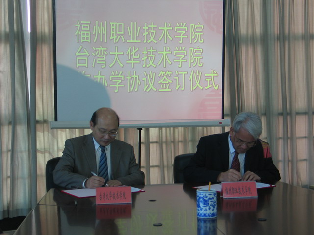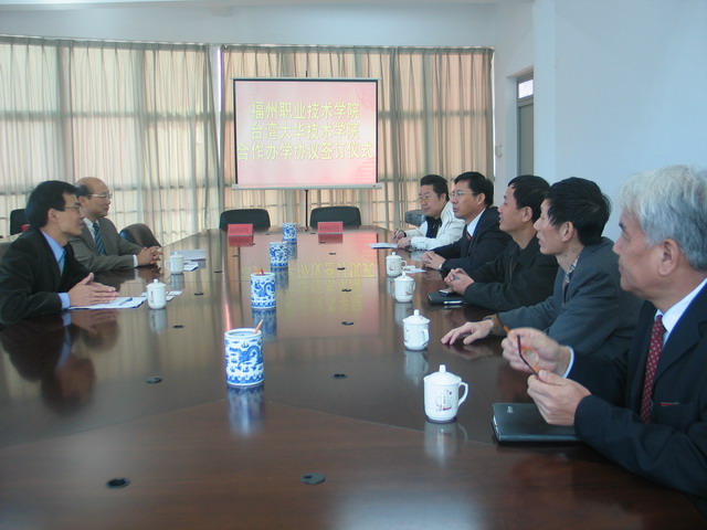 11月28日上午,福州職業(yè)技術學院與臺灣大華技術學院合作辦學意向書簽訂儀式在學院綜合樓515會議室舉行。臺灣大華技術學院教務長劉玉山、主秘杜鳳祺,福州職業(yè)技術學院院長林承超、副院長金昌余、黨委副書記林福榮、黨政辦主任趙君堯、教務處處長林寧參加了簽字儀式。