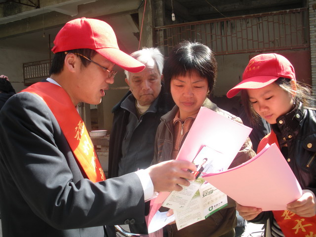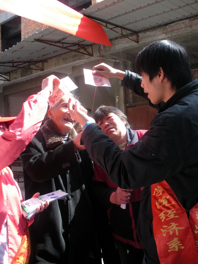 為貫徹學(xué)院黨委精神,經(jīng)濟(jì)系配合有關(guān)部門,組織師生參加了“發(fā)揮專業(yè)優(yōu)勢(shì),深入群眾,為附近村莊群眾提供服務(wù),助推新農(nóng)村建設(shè)”的活動(dòng)。3月15日,經(jīng)濟(jì)系金融保險(xiǎn)專業(yè)和會(huì)計(jì)專業(yè)學(xué)生志愿者和系團(tuán)總支、學(xué)生會(huì)干部結(jié)合專業(yè)和村民所需,精心策劃,為學(xué)院附近村莊送去人壽保險(xiǎn)知識(shí)和真假人民幣的識(shí)別技巧等服務(wù)。