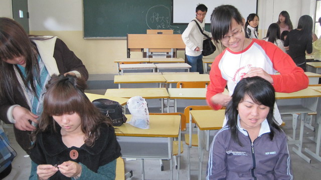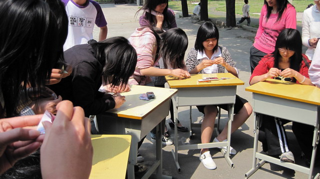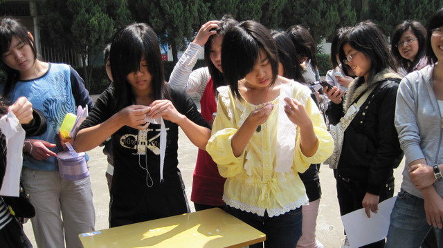 本屆競(jìng)賽項(xiàng)目有:縫紐扣、折千紙鶴、發(fā)型設(shè)計(jì)等??p扣子比賽一開始,選手都眼疾手快地拿起一顆顆扣子,將它熟練地縫在布上,在一旁觀看的同學(xué)們也都目不轉(zhuǎn)睛,暗自佩服;折千紙鶴比賽中,同學(xué)們施展各自才華,他們利用自己的特別折法,速度一個(gè)比一個(gè)快,一只只活靈活現(xiàn)的紙鶴展現(xiàn)在大家眼前,讓在場(chǎng)觀眾驚喜、雀躍;在發(fā)型設(shè)計(jì)比賽中,選手們心靈手巧,給大家?guī)?lái)了美倫美幻的發(fā)型。