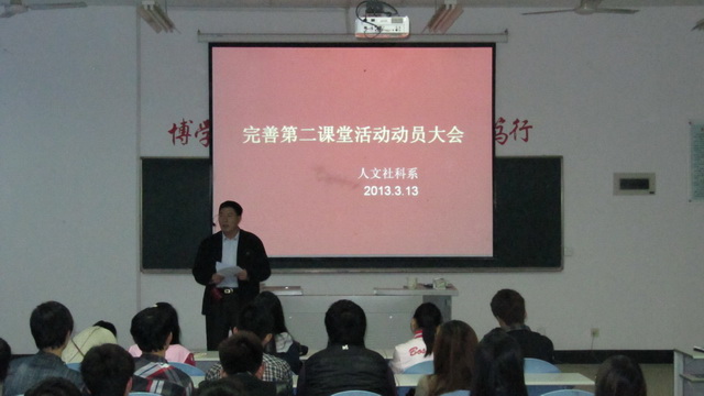 為豐富學生的第二課堂,切實發(fā)揮第二課堂的作用,根據(jù)學院統(tǒng)一部署,結(jié)合本系實際情況,人文社科系于2013年3月13日下午在綜合樓410大多媒體教室召開完善學生第二課堂活動動員大會,全系“兩委”學生干部及各班班委參加會議。