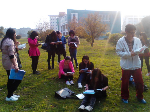 2013年3月14日起,應(yīng)用外語(yǔ)系“二讀二練”之晨讀活動(dòng)全面展開(kāi)。由學(xué)生黨員、各班班委和學(xué)生干部帶頭,幫扶學(xué)習(xí)有困難的同學(xué),在勵(lì)園、噴泉廣場(chǎng)等場(chǎng)所開(kāi)展小組晨讀活動(dòng),形成良好的學(xué)習(xí)氛圍。