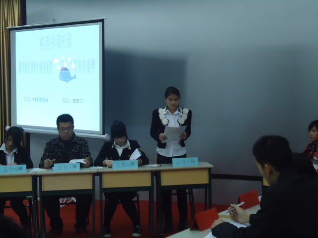 經(jīng)過激烈的初、復(fù)賽角逐,決賽辯題圍繞“構(gòu)建和諧校園,靠學(xué)校紀(jì)律約束更重要,還是靠個(gè)人素質(zhì)更重要”,雙方展開唇槍舌戰(zhàn)、互不示弱,辯詞精彩犀利,辯手們更是妙語連珠、據(jù)理力爭(zhēng),不時(shí)贏得陣陣掌聲。在隊(duì)員的團(tuán)隊(duì)協(xié)作下,最終2012級(jí)旅游管理閩臺(tái)班代表隊(duì)技?jí)喝盒郏霉谲姡?012級(jí)建筑工程管理一班代表隊(duì)榮獲第二名。