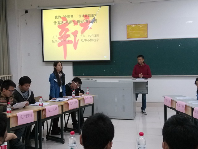 暖春新氣象,能力大比拼。為了更好發(fā)揮同學們的才能,提升演講與辯論水平,展示當代大學生的青春風采,傳遞正能量,2013年4月7日晚上,計算機系在1號教學樓309教室舉行“我的中國夢”傳遞正能量為主題的辯論賽。