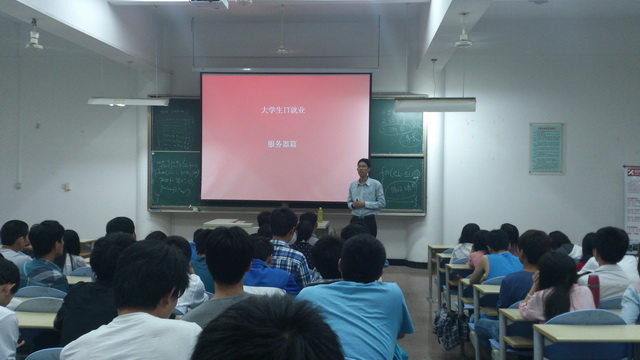 首先,徐老師以一張“大問號——就業(yè)與招聘”的PPT講座演講主題。一是以服務(wù)器為例子,介紹了現(xiàn)今幾種主流服務(wù)器操作系統(tǒng),通過表格對比,體現(xiàn)出LINUX系統(tǒng)的優(yōu)越性;二是利用表格分析了計算機專業(yè)的薪資水平和技術(shù)要求;三是從職業(yè)素質(zhì)角度重點提出作為一名優(yōu)秀的IT人士必須具備良好的溝通能力、優(yōu)秀的服務(wù)意識和心里素質(zhì)、優(yōu)秀的技術(shù)能力和動手能力等7種不可或缺的能力。