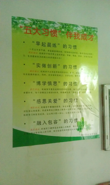 機(jī)械工程系首先做好宣傳動(dòng)員工作,在學(xué)生學(xué)習(xí)實(shí)訓(xùn)、生活起居和課堂上對“五大習(xí)慣”進(jìn)行宣傳講解,讓學(xué)生了解到良好行為習(xí)慣和思維習(xí)慣的養(yǎng)成對于學(xué)生成長成才的重要性,同時(shí)系兩委學(xué)生干部還印發(fā)《五大習(xí)慣伴我成才——機(jī)械工程系學(xué)生良好行為習(xí)慣倡議書》到每個(gè)宿舍,讓學(xué)生們深刻學(xué)習(xí)“五大習(xí)慣”基本內(nèi)涵,審視自身可能存在的缺點(diǎn)和不足,見賢思齊揚(yáng)長避短。