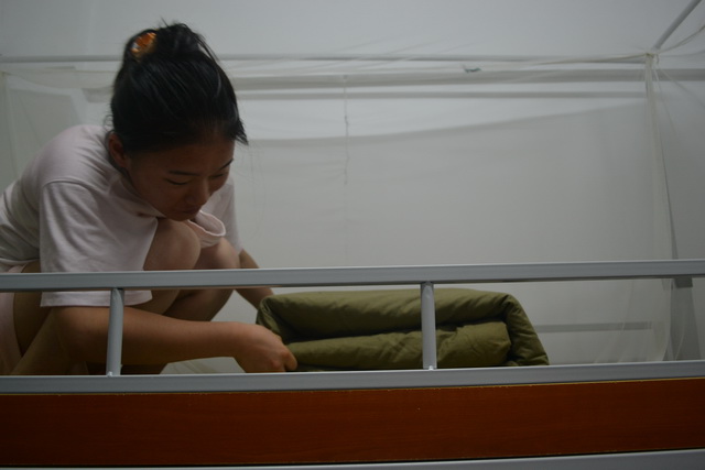 賽前,各班班長(zhǎng)、團(tuán)支書(shū)已在班級(jí)作了大量的宣傳工作,并召開(kāi)了動(dòng)員大會(huì)。在自律會(huì)成員的組織下,32名參賽選手進(jìn)行了比賽。同學(xué)們?cè)诼?tīng)到“開(kāi)始”的口令后,迅速行動(dòng),展開(kāi)、鋪平、折疊、動(dòng)作非常的流暢,舍友們?cè)谂赃吂恼萍佑?一會(huì)兒,“豆腐塊”、 “三角被”就成形了,在規(guī)定的2分鐘時(shí)間里,每個(gè)同學(xué)的被子都成了“豆腐塊”、 “三角被”,有的甚至只用了不到一分鐘便疊好了。評(píng)委們對(duì)參賽選手疊好的被子進(jìn)行“指點(diǎn)”,同學(xué)們受益匪淺。整個(gè)賽場(chǎng)熱情洋溢。