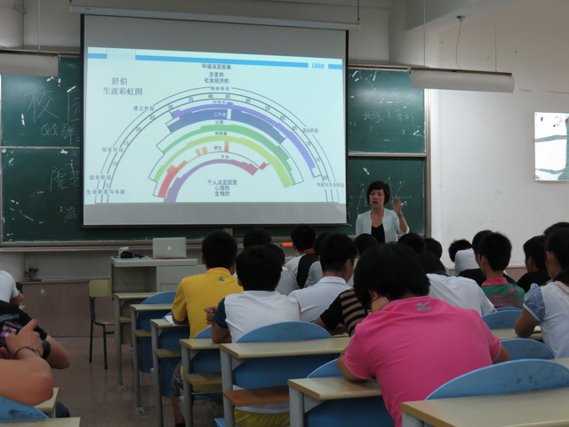 此次講座,曹瑛老師為學生準備了豐富內(nèi)容,理論與實踐結合,師生互動,全場生動、精彩、全面、系統(tǒng)、活潑。她從三個方面對同學們及早建立職業(yè)規(guī)劃意識、掌握職業(yè)規(guī)劃知識進行指導。第一,從肢體語言互動角度,曹老師一開始就跟學生通過“拍手”互動達到了“愛的鼓勵”的作用,老師帶領著學生們一起做,新生們也通過這種新穎的導入方式和大家有了新的接觸和學習;第二,通過理論知識教化,包括動機理論、舒伯的生涯彩虹圖理論、帕森斯的職業(yè)生涯規(guī)劃理論、生命線等理論知識讓學生對職業(yè)生涯規(guī)劃有了專業(yè)的認識和體驗;第三,通過師生共同分享自身故事,學生們不僅對自身有了更深刻的認識,還通過老師的自身情感及理性共享看到了榜樣的力量。最后,職業(yè)生涯規(guī)劃講座在老師和同學們的精彩互動中結束。