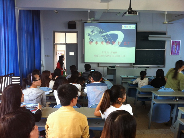 為構(gòu)建畢業(yè)生與用人單位的交流平臺(tái),積極拓寬實(shí)習(xí)渠道。2013年11月3日下午,校企合作企業(yè)福建百納在線網(wǎng)絡(luò)技術(shù)有限公司到商貿(mào)系舉辦就業(yè)指導(dǎo)講座和專場(chǎng)招聘會(huì),2011級(jí)市場(chǎng)營(yíng)銷(xiāo)和電子商務(wù)的畢業(yè)班100多人參加了大會(huì)。