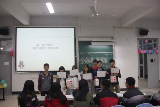經(jīng)濟(jì)系“二早一晚”的晚修項(xiàng)目緊緊結(jié)合專業(yè),經(jīng)過(guò)一段時(shí)間的培育取得了初步成績(jī),為了讓同學(xué)們更深入地了解金融專業(yè)知識(shí),了解金融市場(chǎng)知識(shí),營(yíng)造一種濃厚的學(xué)習(xí)氛圍,經(jīng)過(guò)一個(gè)月的籌備,于2013年12月3日晚上,在2號(hào)樓322教室舉辦“金融知識(shí)競(jìng)賽”。金融協(xié)會(huì)指導(dǎo)老師張彬和企業(yè)指導(dǎo)老師李慧豐出席了此次活動(dòng)并為獲獎(jiǎng)同學(xué)進(jìn)行頒獎(jiǎng)。