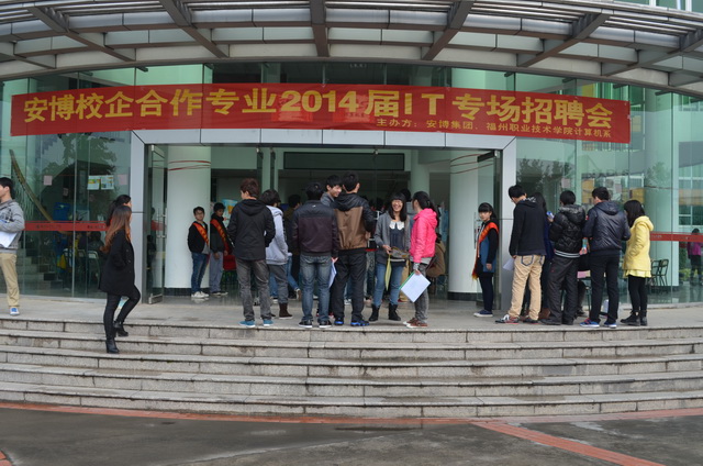 2013年12月13日上午,由安博集團(tuán)與福州職業(yè)技術(shù)學(xué)院計算機(jī)系聯(lián)合舉辦的“安博校企合作專業(yè)2014屆IT專場招聘會”于1號教學(xué)樓大廳隆重召開。福建恭安網(wǎng)盾電子、元豐文化傳播、慧舟信息科技等24家企業(yè)來此與計算機(jī)系學(xué)生進(jìn)行了面對面的溝通交流。