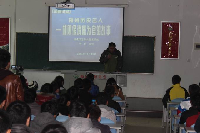 2013年12月18日下午,電子信息工程系在綜合樓511教室開展了 “勵園道德講堂”活動。本次活動邀請了福州民俗文化專家林武老師主講,由輔導(dǎo)員湯紹康主持,全系學(xué)生兩委干部共同參與了活動。