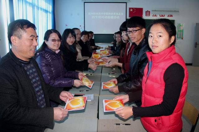 座談會上,教師黨員與結(jié)對的畢業(yè)生交換了“師生聯(lián)系卡”,聯(lián)系卡上不僅有師生各自的聯(lián)系方式,還有祝福的語言。教師黨員們主動了解“雙困生”家庭基本情況、擇業(yè)意向與要求、求職中的實際困難,不僅從精神上給予鼓勵,并有針對性地幫助解決實際困難。最后,黨員老師給結(jié)對的“雙困生”送上了暖水袋,在寒冷的冬天帶給學(xué)生一份最貼近心窩的溫暖。