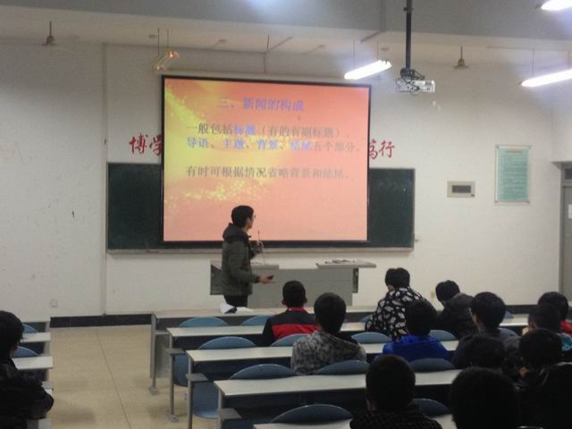 2014年3月4日晚,在實驗樓411教室,機械工程系系學(xué)生會主席張樹堅同學(xué)第一個走上講臺,開展了一場關(guān)于“如何寫好新聞報道”為主題的學(xué)生講座。講座以一個游戲開場,充分調(diào)動了現(xiàn)場的氣氛。全場講座充滿了趣味性和學(xué)習(xí)氛圍,同學(xué)們都認(rèn)真的聽講,積極回答互動。第一場學(xué)生講座的成功開展激發(fā)了學(xué)生的上臺熱情。