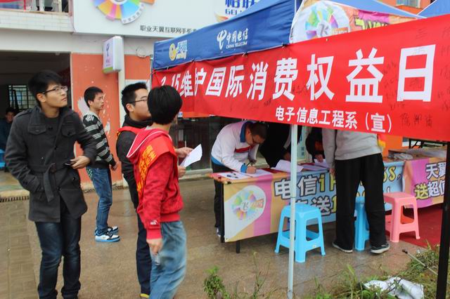為切實(shí)維護(hù)廣大同學(xué)的合法權(quán)益,進(jìn)一步提高大學(xué)生維權(quán)意識(shí),增強(qiáng)大學(xué)生的自我保護(hù)能力,在消費(fèi)者權(quán)益日來(lái)臨之際,電子信息工程系學(xué)生志愿者在學(xué)院二期宿舍區(qū)舉辦了消費(fèi)者權(quán)益日專題宣傳活動(dòng)。