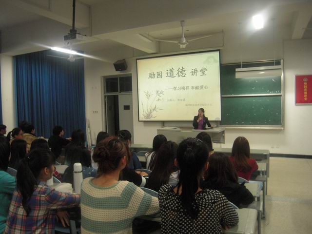 為進(jìn)一步倡導(dǎo)雷鋒精神,提高學(xué)生的道德素養(yǎng),2014年3月26日晚,經(jīng)濟(jì)系在2號教學(xué)樓309教室開展“學(xué)習(xí)榜樣 奉獻(xiàn)愛心”道德講堂活動,本次道德講堂由經(jīng)濟(jì)系郭麗霞書記主講,經(jīng)濟(jì)系120多名學(xué)生參加了此次講堂。