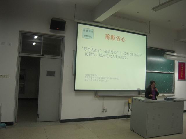 古人曰:“吾日三省吾身”,講堂從“靜默省心”開始,在一分鐘的靜默中讓同學(xué)們靜心,反省了自身的不足。隨后激揚(yáng)的旋律響起,郭書記傾情帶唱《學(xué)習(xí)雷鋒好榜樣》這首耳熟能詳?shù)母枨?,帶動全體學(xué)生一起跟著節(jié)奏合唱。接著學(xué)習(xí)有關(guān)道德的經(jīng)典名句,郭書記做了深刻到位的獨(dú)特講解,讓同學(xué)們有了深刻的感悟。隨后通過對雷鋒、當(dāng)代雷鋒——郭明義,最美媽媽——吳菊萍,最美教師——張麗莉等道德模范人物事跡的學(xué)習(xí)探討,讓同學(xué)們更深刻認(rèn)識道德的偉大。之后兩位學(xué)生代表上臺分享對道德的感悟,情真意切,體會深刻。緊接著大家通過用“鞠躬”的方式,表達(dá)了對崇高道德的敬仰之心。最后,郭書記用“上善若水”、“厚德善行,吉祥相伴”、“勿以惡小而為之,勿以善小而不為”等經(jīng)典名言和吉祥圖片與大家共勉與分享,還給學(xué)生代表送上了小禮物。