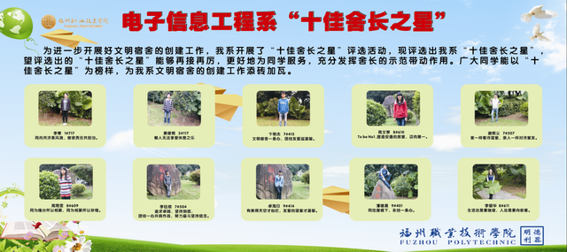 本屆十佳舍長(zhǎng)之星評(píng)選條件涵蓋了精神文明、遵章守紀(jì)、團(tuán)結(jié)友愛(ài)、勤儉節(jié)約、學(xué)風(fēng)建設(shè)、內(nèi)務(wù)衛(wèi)生等六個(gè)方面,評(píng)選過(guò)程公平、公正、公開(kāi),評(píng)選出的十佳舍長(zhǎng)之星將作為電子信息工程系宿舍文化建設(shè)的榜樣進(jìn)行廣泛推廣。這也是電子信息工程系本學(xué)期加強(qiáng)學(xué)生榜樣教育,充分發(fā)揮學(xué)生自我教育、自我管理、自我服務(wù)功能的重要舉措之一。