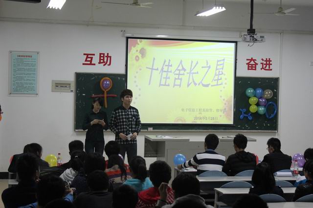 為加強(qiáng)宿舍文化建設(shè),營(yíng)造積極向上的宿舍文化氛圍,2014年3月份電子信息工程系開(kāi)展了以第二屆 “十佳舍長(zhǎng)之星”為主題的評(píng)選活動(dòng),2012級(jí)、2013級(jí)全體宿舍舍長(zhǎng)參加了此次評(píng)選。