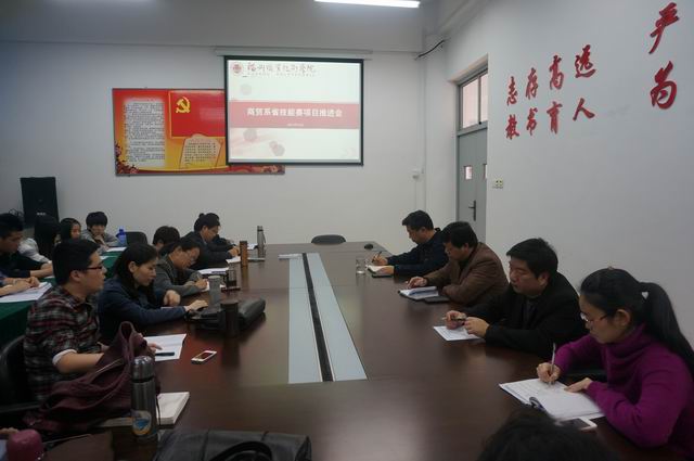 2014年4月14日下午,商貿(mào)系召開現(xiàn)代物流、報關(guān)技能、營銷技能三個省賽項目推進會,系領(lǐng)導(dǎo)、輔導(dǎo)員及三個參加省賽的項目指導(dǎo)老師、參賽學(xué)生參加了會議。