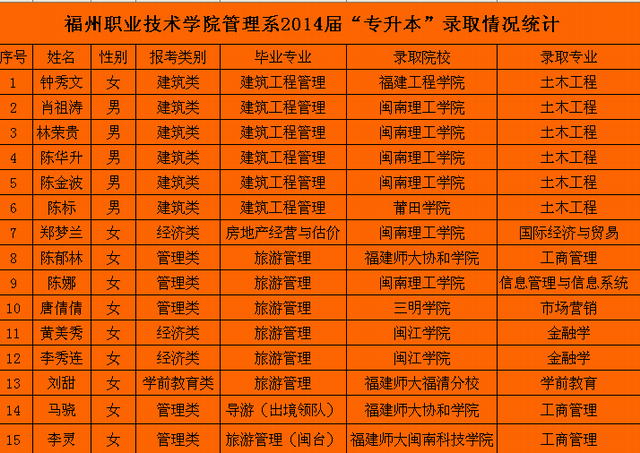 “寶劍鋒從磨礪出,梅花香自苦寒來”,經(jīng)過幾個月的刻苦努力、認真?zhèn)淇?,管理?014屆畢業(yè)生在2014年專升本考試中,分別被省內(nèi)福建師范大學(xué)、福建工程學(xué)院、閩江學(xué)院、莆田學(xué)院、三明學(xué)院、閩南理工學(xué)院六所高校錄取,共計考取15名。