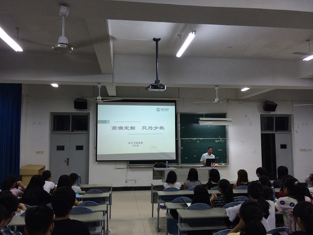 林總首先介紹了其任職的“世界雙500強(qiáng)”—中國(guó)人壽保險(xiǎn)集團(tuán)的簡(jiǎn)況,接著以其豐富的從業(yè)經(jīng)驗(yàn),教導(dǎo)學(xué)生們?nèi)绾潍@取非車險(xiǎn)大項(xiàng)目信息,傳授了拓展非車險(xiǎn)大項(xiàng)目業(yè)務(wù)的知識(shí),怎樣參加保險(xiǎn)大項(xiàng)目招投標(biāo),在拓展保險(xiǎn)大項(xiàng)目過程中如何做到“行、誠、恒、靈、品”5個(gè)字。還引用了大量其平時(shí)從事業(yè)務(wù)和拓展大項(xiàng)目的業(yè)務(wù)實(shí)例,生動(dòng)再現(xiàn)了在激烈的保險(xiǎn)市場(chǎng)競(jìng)爭(zhēng)中保險(xiǎn)從業(yè)人員不畏艱難拼搏向上的開拓精神和勇氣。