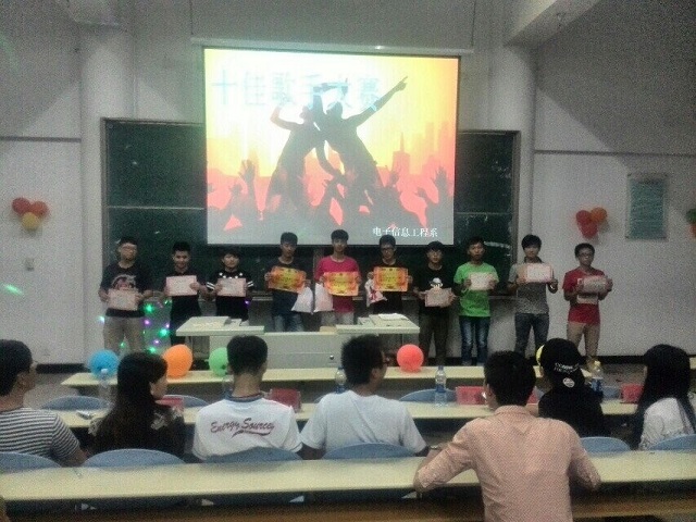 十佳歌手大賽既豐富電子信息工程系學(xué)生課余文化生活,活躍校園文化氣氛,也為喜歡歌唱的同學(xué)們提供了一個表演的舞臺。本次比賽共吸引電子信息工程系30多名選手參加,比賽競爭十分激烈。比賽中,選手們在舞臺上不僅盡情地展示了自己的才藝,創(chuàng)造出了一幅幅聲色兼美的亮麗風(fēng)景,而且還用自己動聽的歌聲展現(xiàn),詮釋著青春飛揚(yáng)的主題。他們簡單明快的曲調(diào),不同的唱法,不同的風(fēng)格,調(diào)動了在場觀眾的熱情氣氛。參賽選手們鎮(zhèn)定自若,對歌曲的演繹和臺風(fēng)的表現(xiàn),展示他們不凡的實(shí)力,同時也表現(xiàn)了大學(xué)生朝氣蓬勃的精神面貌和精湛的藝術(shù)感染力。經(jīng)過激烈的角逐,最終產(chǎn)生了本次比賽的冠軍謝南、亞軍林權(quán)興、季軍林加陽。