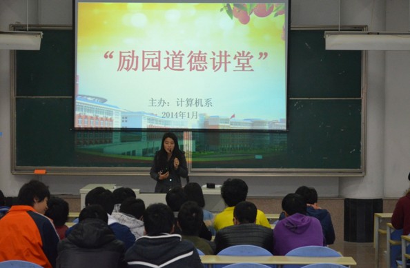 2014年1月8日,計(jì)算機(jī)系在1號(hào)教學(xué)樓301教室開展了主題為“凡人善舉,道德超人”的“勵(lì)園道德講堂”活動(dòng),此次道德講堂由計(jì)算機(jī)系輔導(dǎo)員趙琳琳主講,計(jì)算機(jī)系黨總支副書記陳建國、輔導(dǎo)員和部分學(xué)生代表參加了此次活動(dòng)。