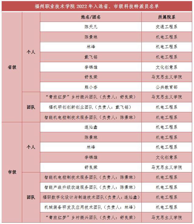 日前,福建省、福州市科技特派員工作聯(lián)席會議辦公室分別公布2022年省、市科技特派員名單,我校教師陳天凡等7人入選省級個人科技特派員,“青旅紅夢”鄉(xiāng)村振興團隊等3個團隊入選省級團隊科技特派員,連燦鑫等5人入選市級個人科技特派員,智能機電控制技術(shù)服務(wù)團隊等5個團隊入選市級團隊科技特派員。
