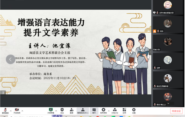 11月10日,由商務(wù)系承辦的第71期勵園講壇“增強語言表達能力 提升文學素養(yǎng)”通過在線直播方式順利舉辦,閩清縣文學藝術(shù)界聯(lián)合會主席池宜滾受邀擔任主講,各院系師生代表線上聆聽講座。
