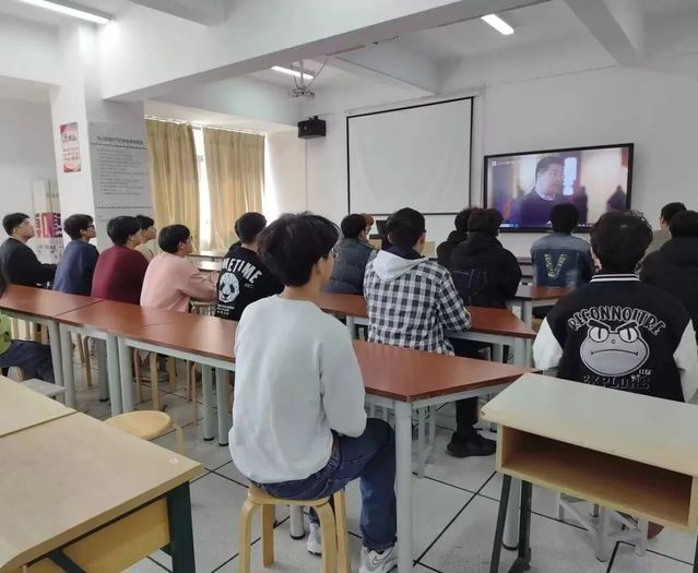 學生正在收看紀念毛澤東等老一輩革命家為雷鋒同志題詞六十周年主題思政課暨職業(yè)學校“同上一堂思政大課”