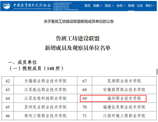 近日,中國教育國際交流協(xié)會官網(wǎng)發(fā)布《關(guān)于魯班工坊建設(shè)聯(lián)盟新增成員單位的公告》,福州職業(yè)技術(shù)學(xué)院成功入選魯班工坊聯(lián)盟成員單位。