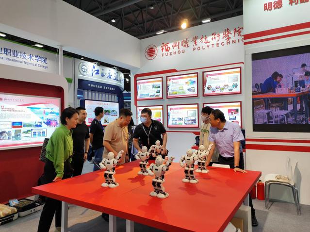 活動(dòng)進(jìn)行了職業(yè)教育科技創(chuàng)新成果與數(shù)智實(shí)訓(xùn)裝備技術(shù)展和“雙高計(jì)劃”中期建設(shè)成果展。我校在展覽中精心安排了靜態(tài)成果展示和現(xiàn)場(chǎng)表演兩大部分,以“勵(lì)園紅”為主題的展位在展館中顯眼奪目。展覽從黨的建設(shè)、人才培養(yǎng)、學(xué)校治理等十個(gè)板塊,圖文并茂、言簡(jiǎn)意賅地介紹學(xué)校自2019年以來開展“雙高計(jì)劃”建設(shè)取得的辦學(xué)成就。機(jī)電工程系師生運(yùn)用FDM打印機(jī),現(xiàn)場(chǎng)演示師生在線材打印應(yīng)用情境下的建模和編程能力;智能工程系師生運(yùn)用跳舞機(jī)器人,編輯《茉莉花》《戲曲聯(lián)唱》《中國(guó)功夫》等舞蹈節(jié)目,引來眾多關(guān)注;特殊教育系的蛋雕作品融繪畫、雕刻于一體,突出了學(xué)校在特殊教育領(lǐng)域的突出成就;文化創(chuàng)意系的壽山石雕融合哲學(xué)、國(guó)畫及木雕、玉雕等多種民間工藝,展示學(xué)校傳承優(yōu)秀傳統(tǒng)技藝的教育追求和精益求精的工匠精神?,F(xiàn)場(chǎng)工藝演示環(huán)節(jié)更是吸引眾多領(lǐng)導(dǎo)嘉賓、與會(huì)代表及現(xiàn)場(chǎng)觀眾的駐足觀賞、交口稱贊。本次展覽充分展示了學(xué)?!半p高計(jì)劃”的建設(shè)成果,提升了學(xué)校的知名度。