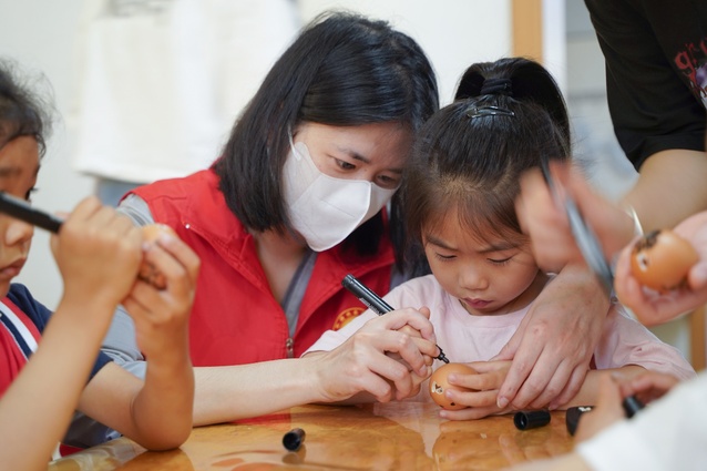 在活動中,黃楊隆老師和特教系的同學(xué)們耐心為孩子們演示蛋雕基本手法,手把手傳授基本技巧,特教學(xué)子與孩子們友愛互動,默契配合,充分發(fā)揮孩子們的想象力與創(chuàng)造力,在師生們的指導(dǎo)下孩子們開心地完成了各自的手工蛋雕作品。