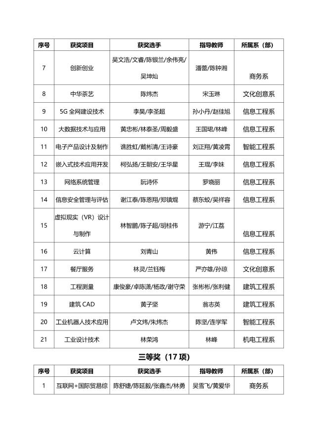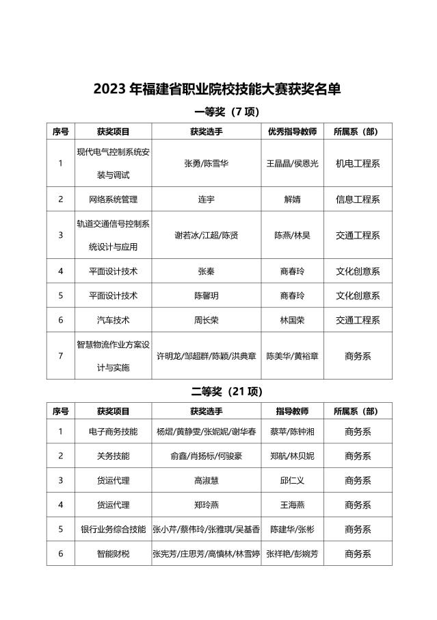 5月26日,福建省職業(yè)院校技能大賽組委會公布2023年度福建省職業(yè)院校技能大賽獲獎名單,我校選派隊伍參與現(xiàn)代電氣控制系統(tǒng)安裝與調試等50個賽項的角逐,共獲得一等獎7項、二等獎21項、三等獎17項,9位指導教師獲得優(yōu)秀指導教師稱號,2位教師獲得優(yōu)秀工作者稱號,學校連續(xù)13年獲得團體優(yōu)勝獎。