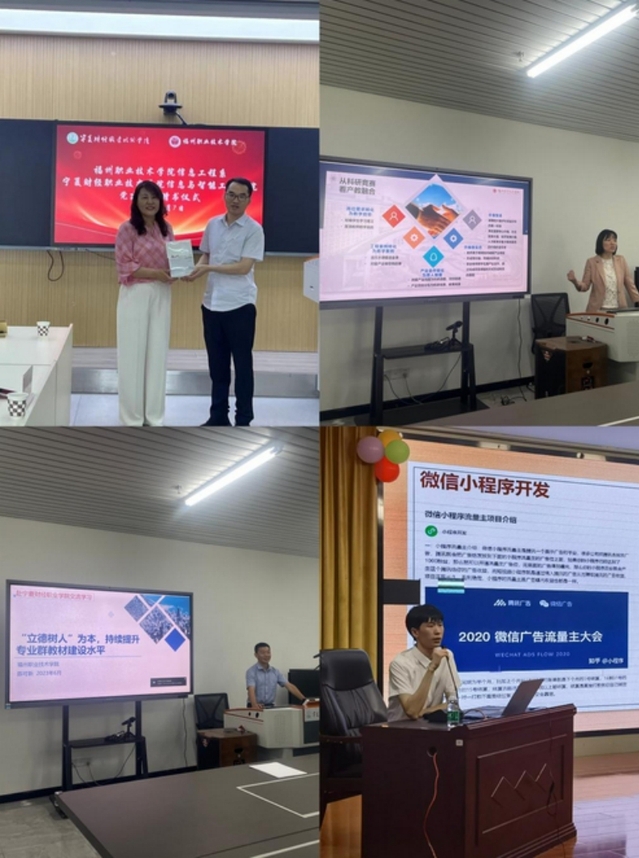 寧夏財(cái)經(jīng)職業(yè)技術(shù)學(xué)院信息與智能工程學(xué)院舉行了歡迎見面會(huì),寧夏財(cái)經(jīng)職業(yè)技術(shù)學(xué)院馬成旭副校長出席會(huì)議并致歡迎辭。在6月5日至8日的活動(dòng)中,雙方開展了教材開發(fā)和教法分享、技能競賽集訓(xùn)、教學(xué)能力比賽、科研、創(chuàng)新創(chuàng)業(yè)和教學(xué)管理經(jīng)驗(yàn)交流等活動(dòng)。雙方圍繞黨建思政工作,舉辦了黨建思政和黨建工作樣板支部建設(shè)交流分享會(huì),開展了主題為“重實(shí)踐 建新功 閩寧攜手共發(fā)展”的黨日活動(dòng)。在分享會(huì)上,信息工程系向?qū)Ψ劫?zèng)送了《新時(shí)代福建省黨建工作品牌優(yōu)秀案例選》一書,該書信息工程系有1個(gè)案例入選,是新時(shí)代福建黨建工作高質(zhì)量發(fā)展的指導(dǎo)讀物。兩校學(xué)生也進(jìn)行了交流活動(dòng),信息工程系劉青山同學(xué)分享了技能競賽及專業(yè)學(xué)習(xí)的經(jīng)驗(yàn),現(xiàn)場互動(dòng)頻繁,掌聲不斷,氣氛熱烈。