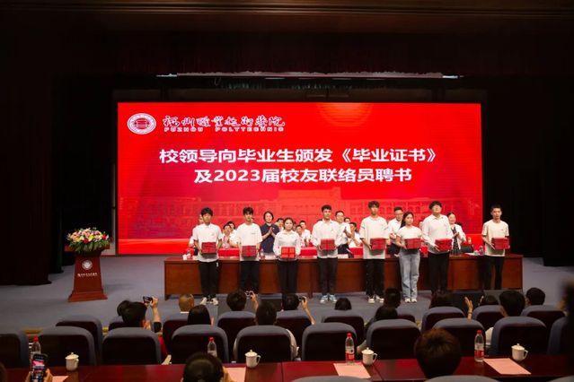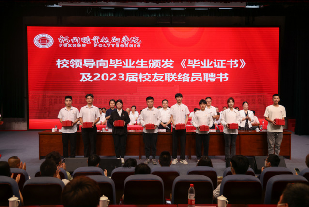 校領(lǐng)導(dǎo)分別為2023屆畢業(yè)生、2023屆校友聯(lián)絡(luò)員頒發(fā)畢業(yè)證書(shū)、校友聯(lián)絡(luò)員聘書(shū),向?qū)W校獎(jiǎng)學(xué)金、“三好學(xué)生”、“優(yōu)秀學(xué)生干部”獲獎(jiǎng)學(xué)生代表頒獎(jiǎng)。張?zhí)m英、劉春蘭、陳偉分別宣讀了畢業(yè)文件、校友聯(lián)絡(luò)員聘任決定、表彰決定、征兵倡議書(shū)、《致2023屆福職院畢業(yè)生校友的一封信》等。