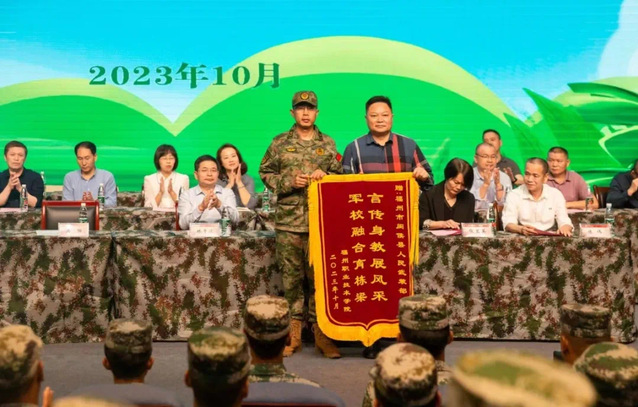 陳念東校長(zhǎng)代表學(xué)校向本次軍訓(xùn)承訓(xùn)單位閩侯縣人武部贈(zèng)送錦旗。