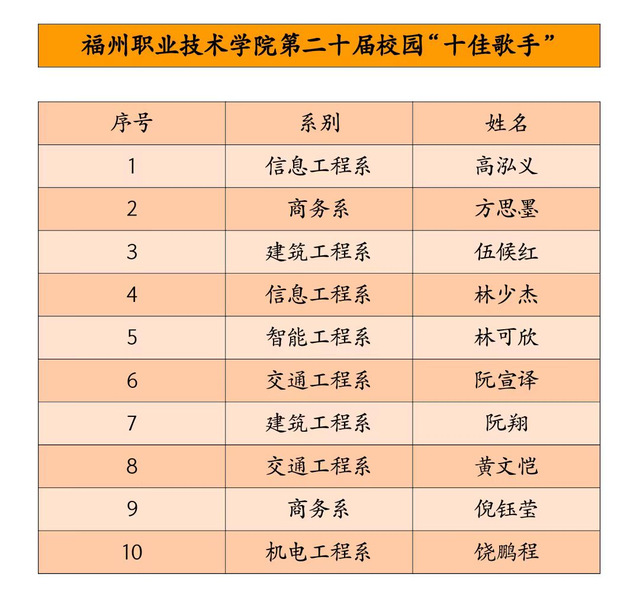 經過初賽選拔,共有13名優(yōu)秀選手站上決賽舞臺。選手們在表演中展現了自己的獨特風格和音樂魅力,給觀眾帶來了一場精彩的視聽盛宴。經過激烈角逐,信息工程系高泓義等10名同學脫穎而出,獲得學校第二十屆“校園十佳歌手”稱號。