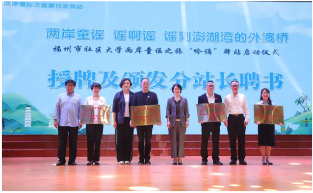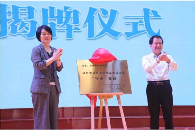 啟動(dòng)儀式上,福州海峽兩岸和平統(tǒng)一促進(jìn)會(huì)會(huì)長(zhǎng)陳承茂和福州職業(yè)技術(shù)學(xué)院副校長(zhǎng)、福州市社區(qū)大學(xué)校務(wù)委員會(huì)委員張?zhí)m英共同為福州市社區(qū)大學(xué)兩岸童謠之旅“吟誦”驛站揭牌。