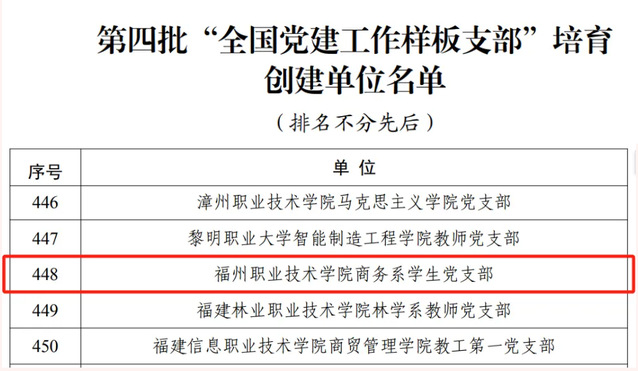 近日,教育部公布第四批新時代高校黨建示范創(chuàng)建和質(zhì)量創(chuàng)優(yōu)工作培育創(chuàng)建單位名單,我校商務(wù)系學(xué)生黨支部入選第四批“全國黨建工作樣板支部”培育創(chuàng)建單位,這是學(xué)校培育創(chuàng)建的第三個國家級黨建工作樣板支部。