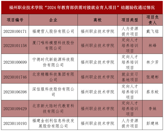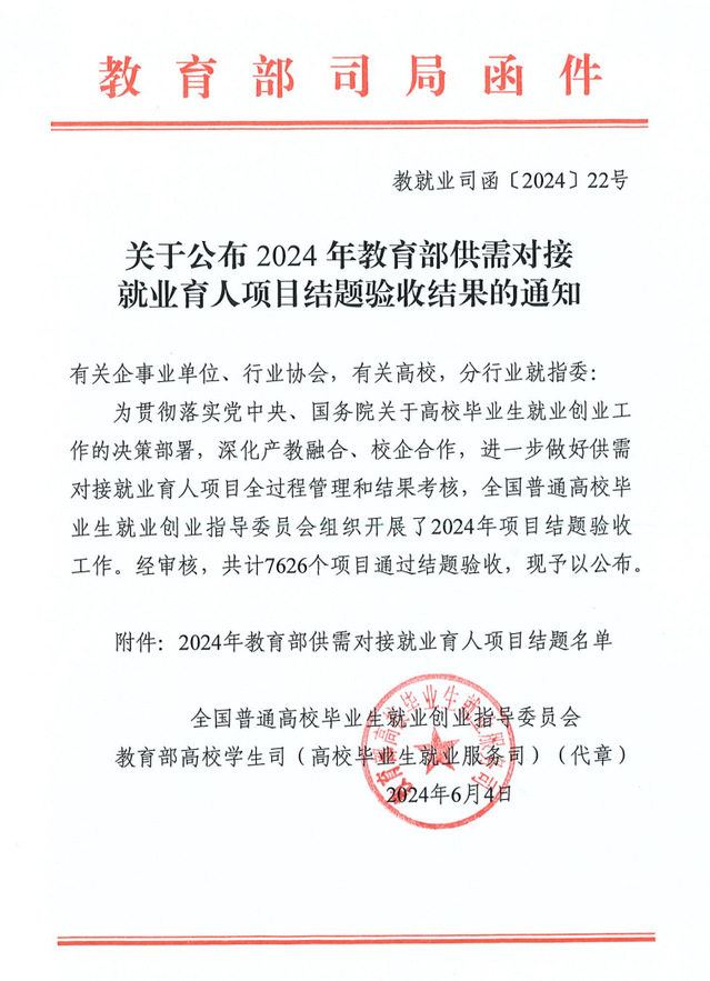 近日,教育部高校學(xué)生司印發(fā)了《關(guān)于公布2024年教育部供需對接就業(yè)育人項(xiàng)目結(jié)題驗(yàn)收結(jié)果的通知》(教就業(yè)司函〔2024〕22號),我校7個項(xiàng)目順利通過結(jié)題驗(yàn)收,其中,定向人才培養(yǎng)培訓(xùn)項(xiàng)目4個、人力資源提升項(xiàng)目2個、就業(yè)實(shí)習(xí)基地項(xiàng)目1個。
