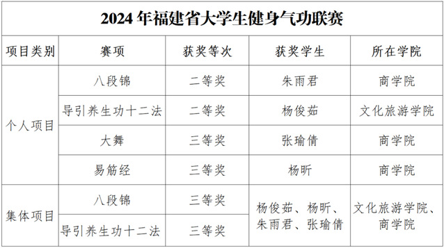 近日,由福建省教育廳主辦、廈門(mén)大學(xué)承辦的2024年福建省大學(xué)生健身氣功聯(lián)賽圓滿(mǎn)落幕。本次比賽聚集了省內(nèi)27所高校的59支隊(duì)伍,共220余名運(yùn)動(dòng)員參與,我校代表隊(duì)?wèi){借扎實(shí)的功底和頑強(qiáng)的拼搏精神,榮獲二等獎(jiǎng)2項(xiàng)、三等獎(jiǎng)4項(xiàng)。