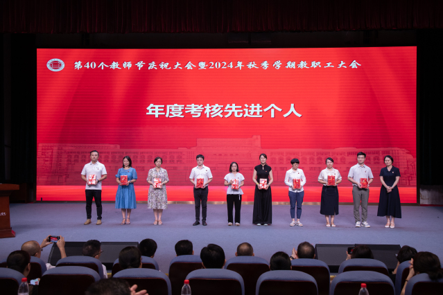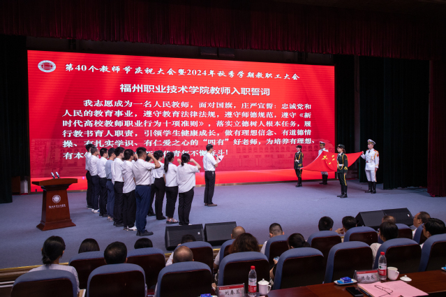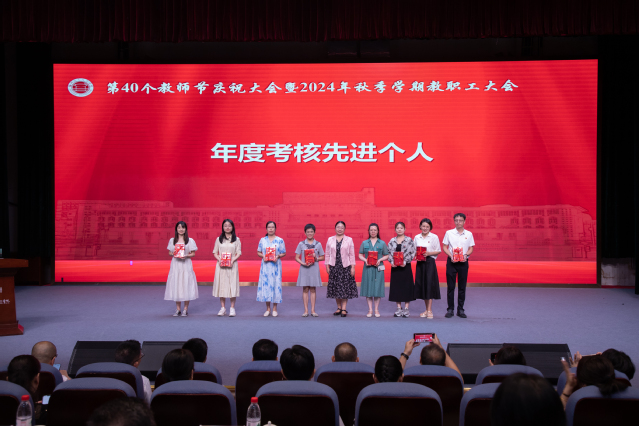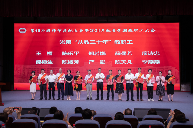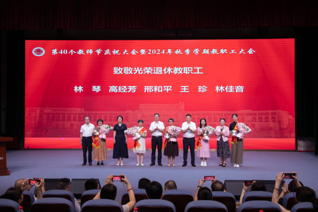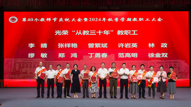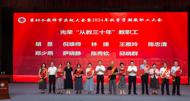 王建生書(shū)記代表學(xué)校黨委向全校教師和離退休老同志致以節(jié)日的問(wèn)候,向?yàn)閷W(xué)校教育事業(yè)付出心血和汗水的廣大教師和教育工作者致以崇高的敬意,向受表彰的先進(jìn)集體和個(gè)人表示祝賀,并向新入職教師表示歡迎。王建生書(shū)記在講話(huà)中提出三點(diǎn)希望:一是要樂(lè)教。教師是立教之本、興教之源,社會(huì)上尊師、敬師、愛(ài)師,我們要秉承“當(dāng)老師好”的理念樂(lè)于從教、自信從教、長(zhǎng)期從教。二是要善教。向身邊榜樣看齊,自覺(jué)踐行教育家精神,成為品德高、能力強(qiáng)的良師,我們要秉承“當(dāng)好老師”的理念啟智潤(rùn)心、立德樹(shù)人。三是要重教。強(qiáng)化黨建引領(lǐng)、完善規(guī)章制度、美化校園環(huán)境,進(jìn)一步增強(qiáng)廣大教師的幸福感、成就感、榮譽(yù)感,我們要秉承“當(dāng)好老師的堅(jiān)強(qiáng)后盾”的理念為高素質(zhì)專(zhuān)業(yè)化教師隊(duì)伍建設(shè)夯實(shí)基礎(chǔ)。他表示,全校要學(xué)習(xí)宣傳貫徹全國(guó)教育大會(huì)精神,深刻領(lǐng)悟習(xí)近平總書(shū)記重要講話(huà)精神實(shí)質(zhì)和核心要義,以高度的責(zé)任感、使命感推動(dòng)學(xué)校十大專(zhuān)項(xiàng)行動(dòng)、學(xué)校申報(bào)“新雙高”等重大任務(wù),為推進(jìn)中國(guó)式現(xiàn)代化福州實(shí)踐貢獻(xiàn)福職力量,為實(shí)現(xiàn)教育強(qiáng)國(guó)戰(zhàn)略目標(biāo)貢獻(xiàn)福職力量!