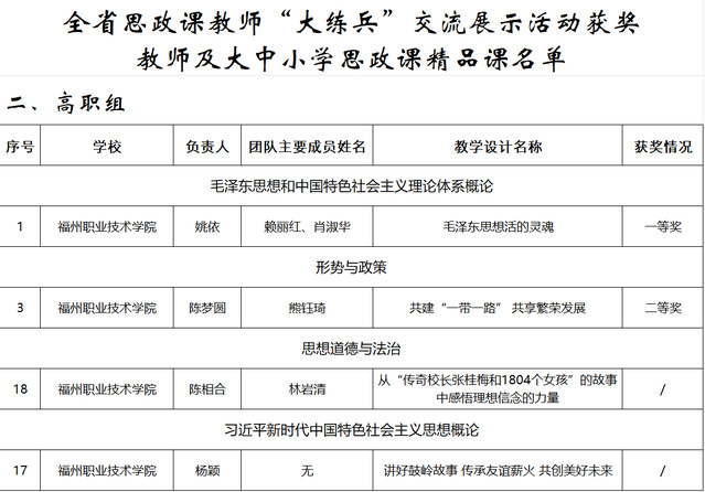 近日,《福建省教育廳關(guān)于公布全省思政課教師“大練兵”交流展示活動評選結(jié)果的通知》(閩教思〔2024〕26號)文件公布,本次比賽經(jīng)學(xué)校推薦、專家評審、現(xiàn)場展示、網(wǎng)絡(luò)公示等環(huán)節(jié),我校報送的4項大中小學(xué)思政課精品課全部立項,其中姚依老師榮獲《毛澤東思想和中國特色社會主義理論體系概論》高職組一等獎,陳夢圓老師榮獲《形勢與政策》高職組二等獎。