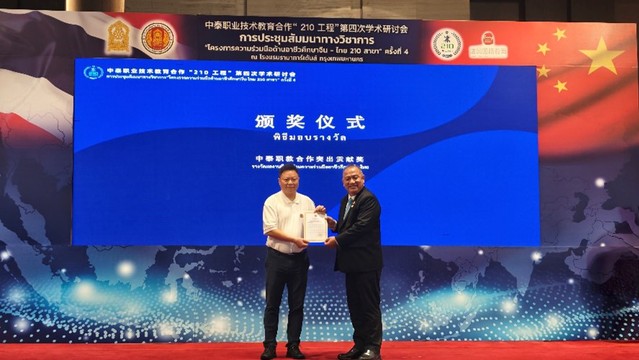 8日下午,陳念東校長(zhǎng)在博覽會(huì)上領(lǐng)取了“中泰職業(yè)教育合作突出貢獻(xiàn)獎(jiǎng)”。學(xué)校于2019年與曼谷職教中心及其下屬曼谷邦納商業(yè)學(xué)院、曼谷拉差希塔蘭技術(shù)學(xué)院開(kāi)展合作,目前項(xiàng)目已招錄培養(yǎng)了78名專(zhuān)業(yè)學(xué)生,有效推動(dòng)中泰職業(yè)教育交流,提升中國(guó)職業(yè)教育國(guó)際影響力。鑒于學(xué)校在中泰職業(yè)教育合作中的杰出貢獻(xiàn),泰國(guó)教育部職業(yè)教育委員會(huì)授予學(xué)校“中泰職業(yè)教育合作突出貢獻(xiàn)獎(jiǎng)”。